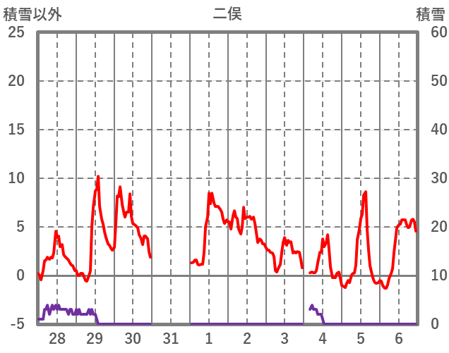 | 日 | 時 | 気温 | 降水 | 風向/風速 | 日照 | 積雪 | 降雪 |