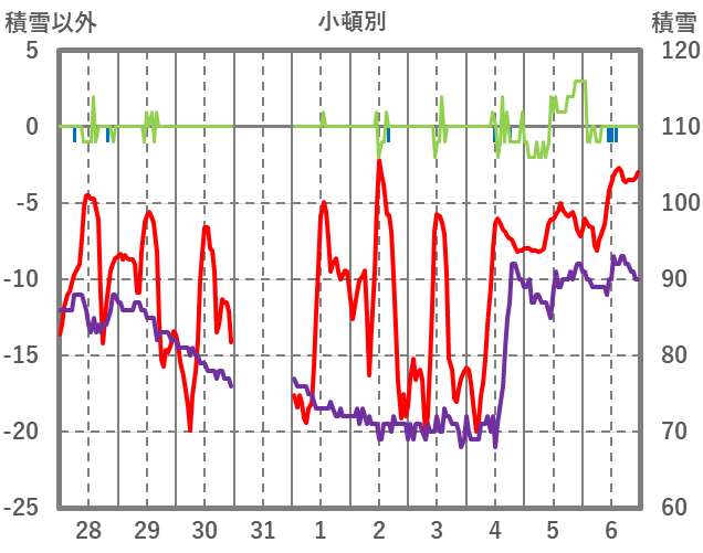 | 日 | 時 | 気温 | 降水 | 風向/風速 | 日照 | 積雪 | 降雪 |