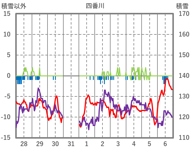 | 日 | 時 | 気温 | 降水 | 風向/風速 | 日照 | 積雪 | 降雪 |