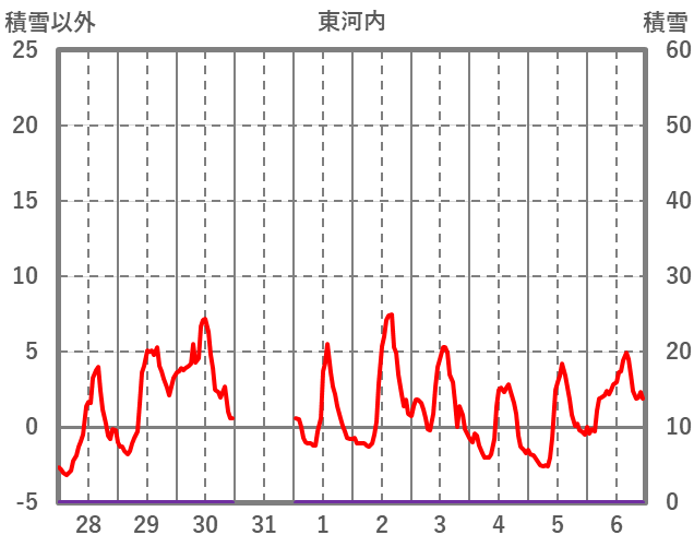 | 日 | 時 | 気温 | 降水 | 風向/風速 | 日照 | 積雪 | 降雪 |