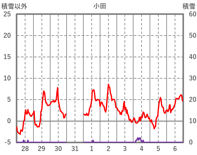 | 日 | 時 | 気温 | 降水 | 風向/風速 | 日照 | 積雪 | 降雪 |