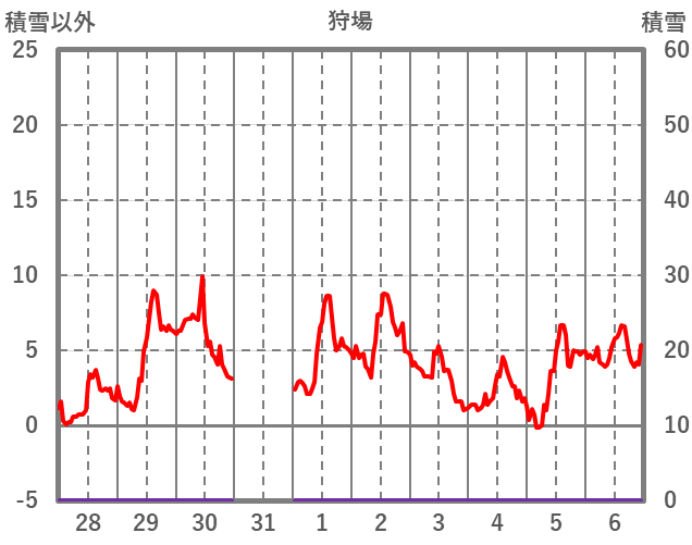 | 日 | 時 | 気温 | 降水 | 風向/風速 | 日照 | 積雪 | 降雪 |