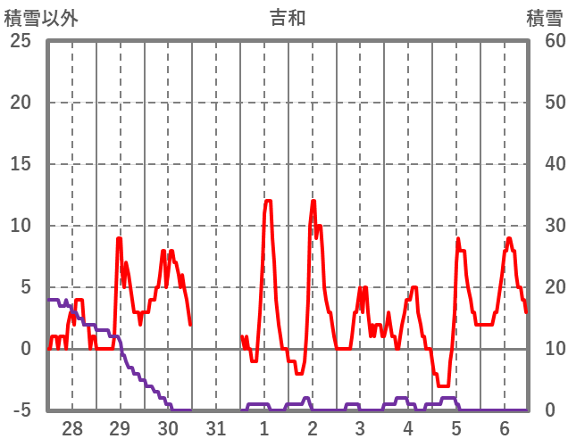 | 日 | 時 | 気温 | 降水 | 風向/風速 | 日照 | 積雪 | 降雪 |