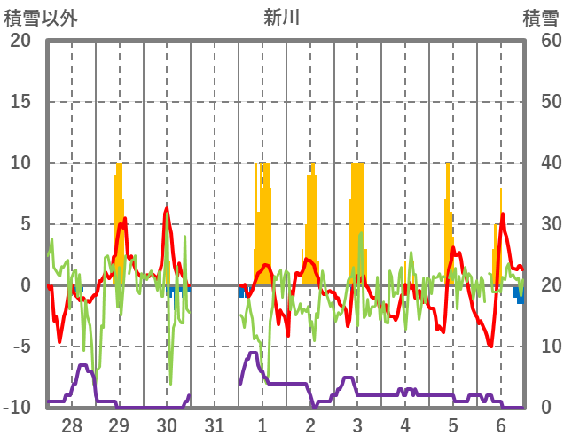 | 日 | 時 | 気温 | 降水 | 風向/風速 | 日照 | 積雪 | 降雪 |