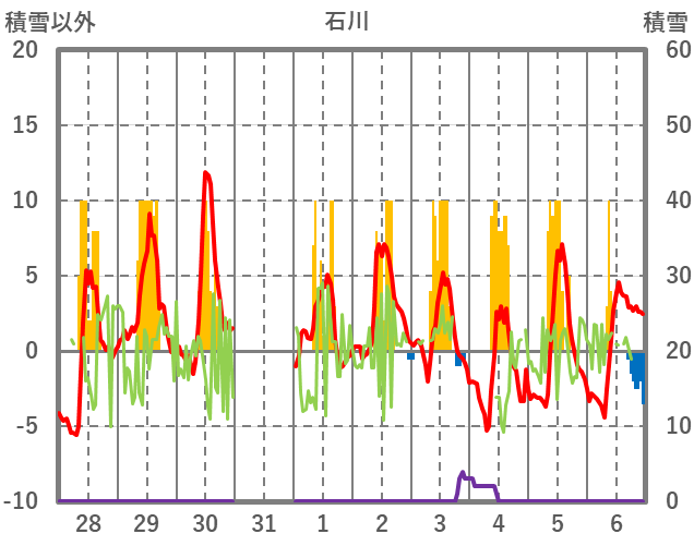 | 日 | 時 | 気温 | 降水 | 風向/風速 | 日照 | 積雪 | 降雪 |