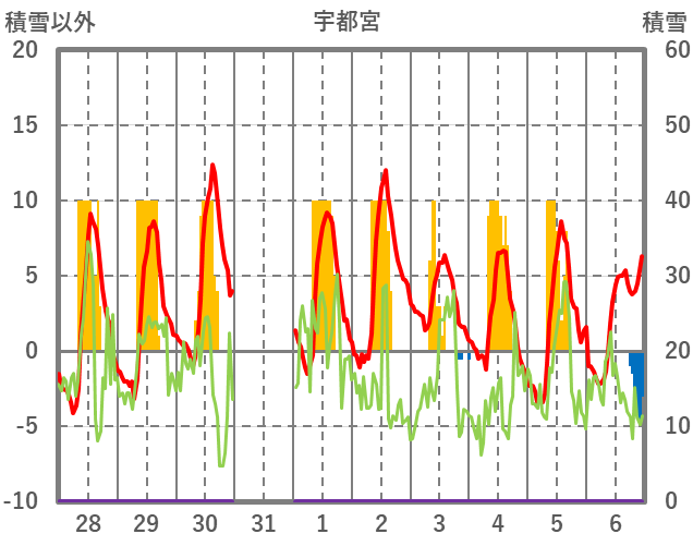 | 日 | 時 | 気温 | 降水 | 風向/風速 | 日照 | 積雪 | 降雪 |