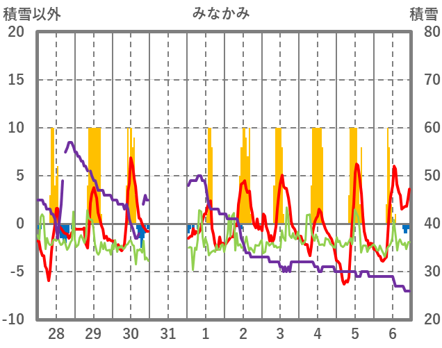 | 日 | 時 | 気温 | 降水 | 風向/風速 | 日照 | 積雪 | 降雪 |