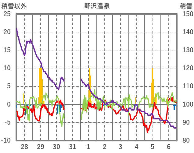 | 日 | 時 | 気温 | 降水 | 風向/風速 | 日照 | 積雪 | 降雪 |