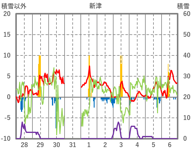 | 日 | 時 | 気温 | 降水 | 風向/風速 | 日照 | 積雪 | 降雪 |