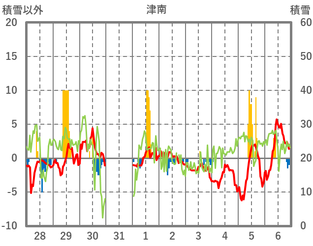 | 日 | 時 | 気温 | 降水 | 風向/風速 | 日照 | 積雪 | 降雪 |