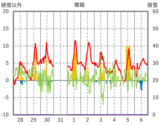 | 日 | 時 | 気温 | 降水 | 風向/風速 | 日照 | 積雪 | 降雪 |