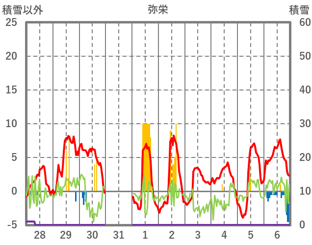 | 日 | 時 | 気温 | 降水 | 風向/風速 | 日照 | 積雪 | 降雪 |