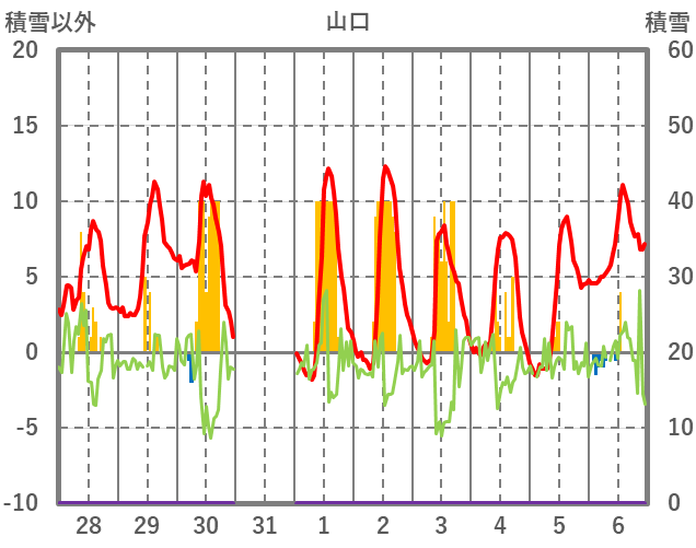| 日 | 時 | 気温 | 降水 | 風向/風速 | 日照 | 積雪 | 降雪 |