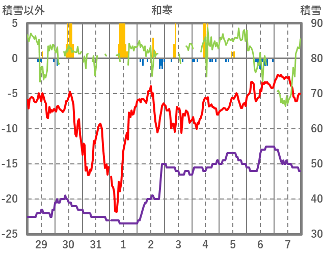 | 日 | 時 | 気温 | 降水 | 風向/風速 | 日照 | 積雪 | 降雪 |