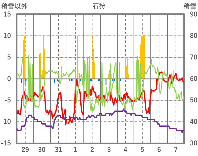 | 日 | 時 | 気温 | 降水 | 風向/風速 | 日照 | 積雪 | 降雪 |