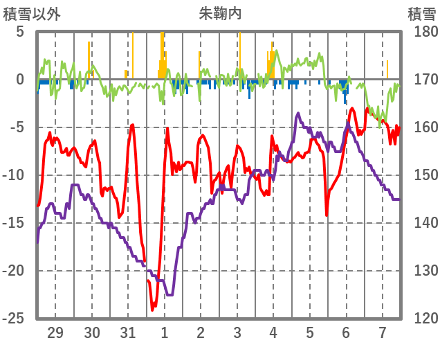 | 日 | 時 | 気温 | 降水 | 風向/風速 | 日照 | 積雪 | 降雪 |