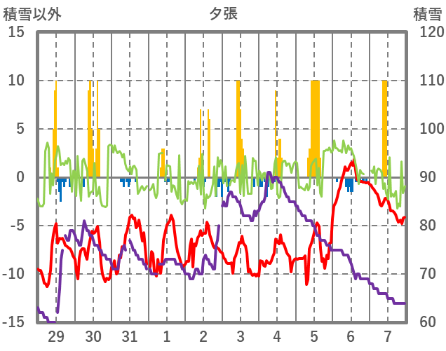 | 日 | 時 | 気温 | 降水 | 風向/風速 | 日照 | 積雪 | 降雪 |