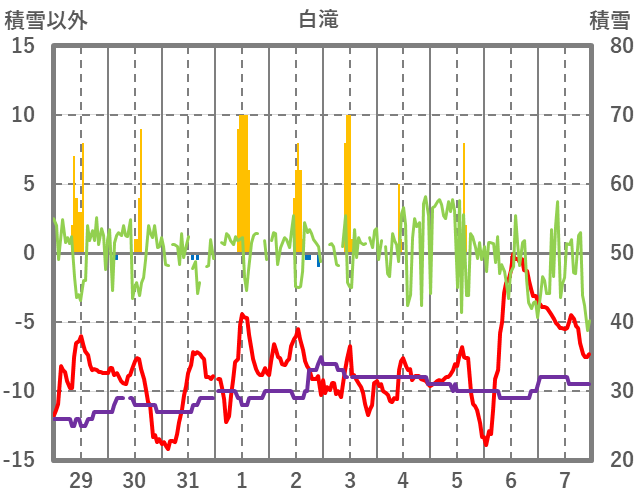 | 日 | 時 | 気温 | 降水 | 風向/風速 | 日照 | 積雪 | 降雪 |