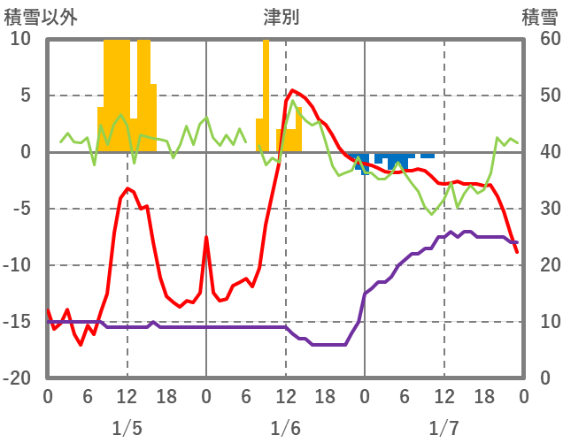 | 日 | 時 | 気温 | 降水 | 風向/風速 | 日照 | 積雪 | 降雪 |