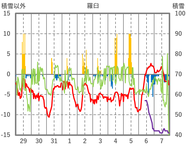 | 日 | 時 | 気温 | 降水 | 風向/風速 | 日照 | 積雪 | 降雪 |