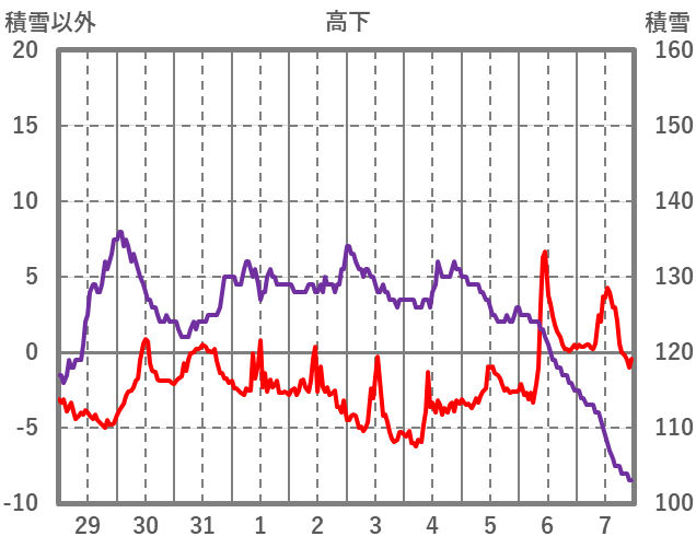 | 日 | 時 | 気温 | 降水 | 風向/風速 | 日照 | 積雪 | 降雪 |