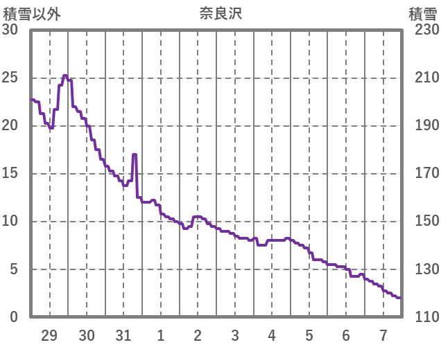 | 日 | 時 | 気温 | 降水 | 風向/風速 | 日照 | 積雪 | 降雪 |