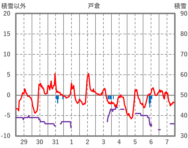 | 日 | 時 | 気温 | 降水 | 風向/風速 | 日照 | 積雪 | 降雪 |
