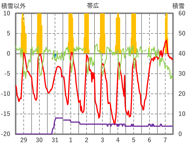 | 日 | 時 | 気温 | 降水 | 風向/風速 | 日照 | 積雪 | 降雪 |