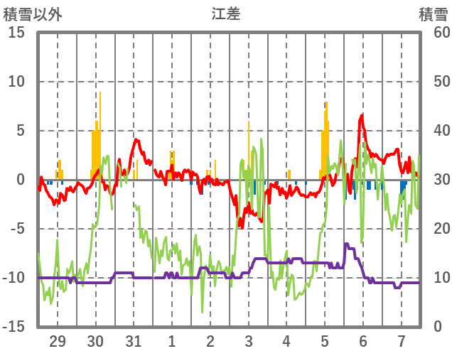 | 日 | 時 | 気温 | 降水 | 風向/風速 | 日照 | 積雪 | 降雪 |