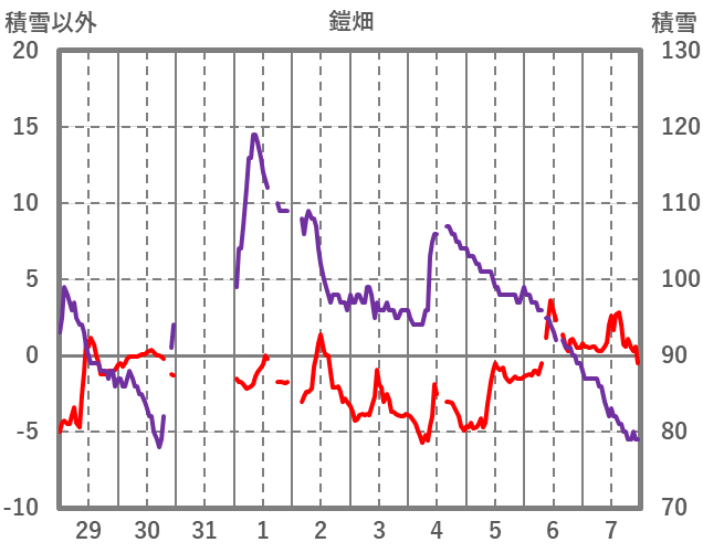 | 日 | 時 | 気温 | 降水 | 風向/風速 | 日照 | 積雪 | 降雪 |