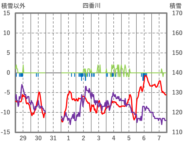 | 日 | 時 | 気温 | 降水 | 風向/風速 | 日照 | 積雪 | 降雪 |