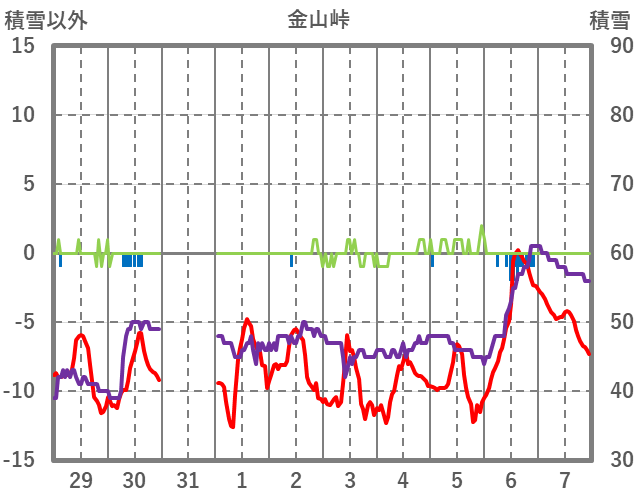 | 日 | 時 | 気温 | 降水 | 風向/風速 | 日照 | 積雪 | 降雪 |