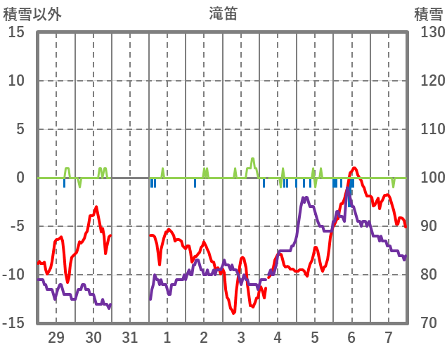 | 日 | 時 | 気温 | 降水 | 風向/風速 | 日照 | 積雪 | 降雪 |