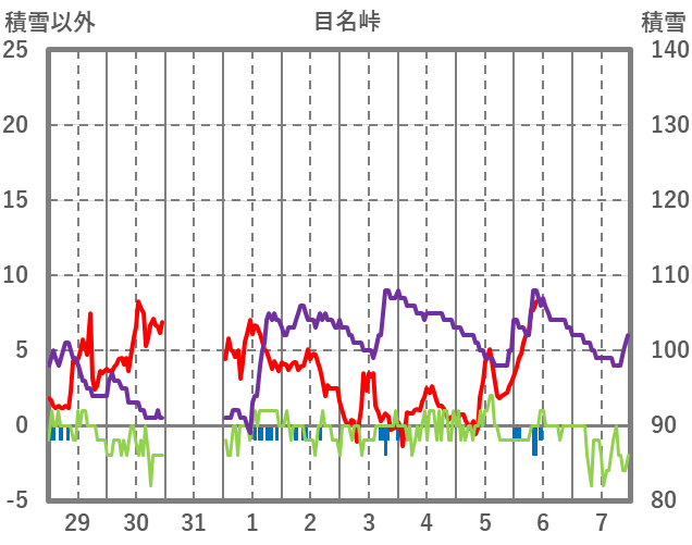 | 日 | 時 | 気温 | 降水 | 風向/風速 | 日照 | 積雪 | 降雪 |