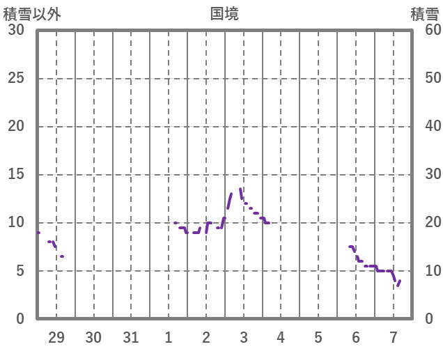 | 日 | 時 | 気温 | 降水 | 風向/風速 | 日照 | 積雪 | 降雪 |