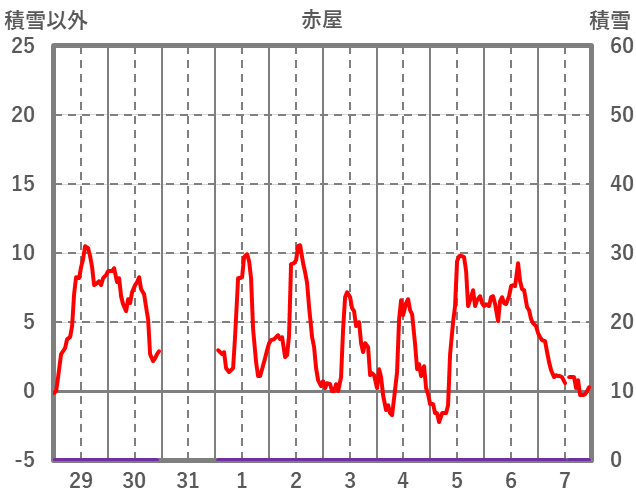 | 日 | 時 | 気温 | 降水 | 風向/風速 | 日照 | 積雪 | 降雪 |