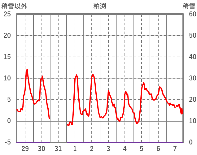 | 日 | 時 | 気温 | 降水 | 風向/風速 | 日照 | 積雪 | 降雪 |