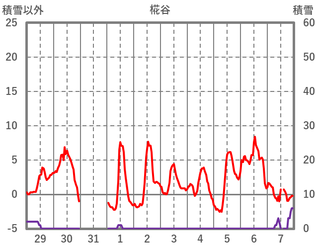 | 日 | 時 | 気温 | 降水 | 風向/風速 | 日照 | 積雪 | 降雪 |