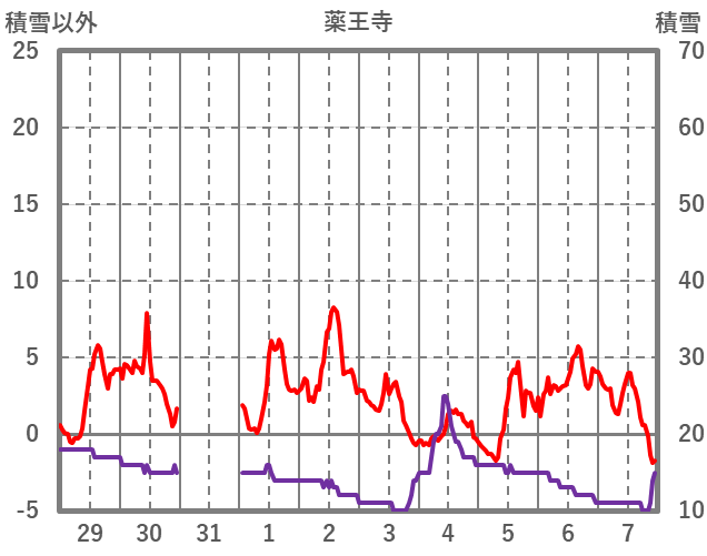 | 日 | 時 | 気温 | 降水 | 風向/風速 | 日照 | 積雪 | 降雪 |
