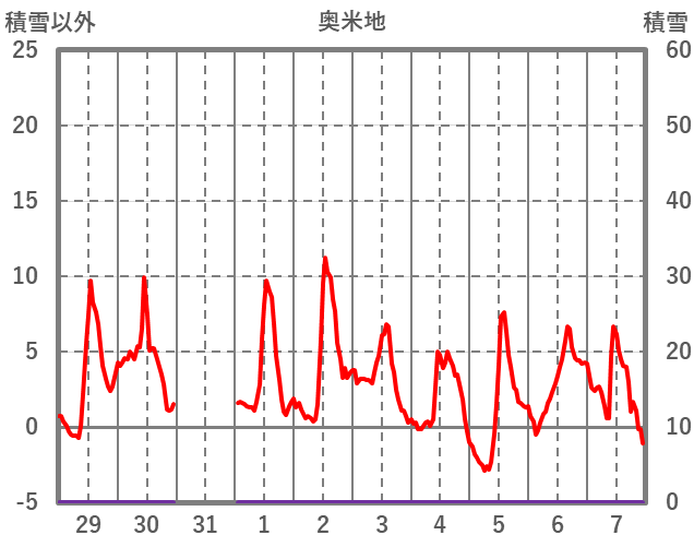 | 日 | 時 | 気温 | 降水 | 風向/風速 | 日照 | 積雪 | 降雪 |