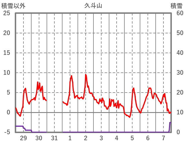 | 日 | 時 | 気温 | 降水 | 風向/風速 | 日照 | 積雪 | 降雪 |