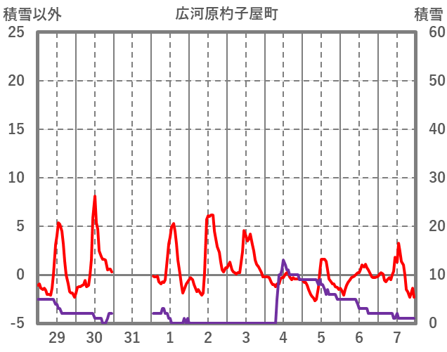 | 日 | 時 | 気温 | 降水 | 風向/風速 | 日照 | 積雪 | 降雪 |