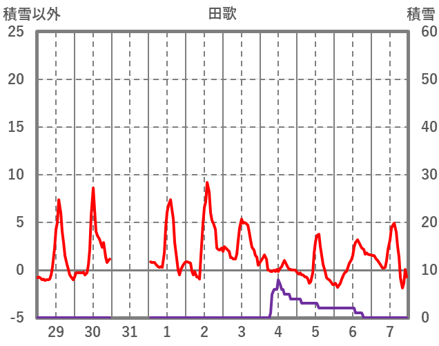 | 日 | 時 | 気温 | 降水 | 風向/風速 | 日照 | 積雪 | 降雪 |