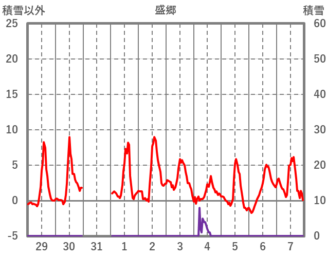 | 日 | 時 | 気温 | 降水 | 風向/風速 | 日照 | 積雪 | 降雪 |