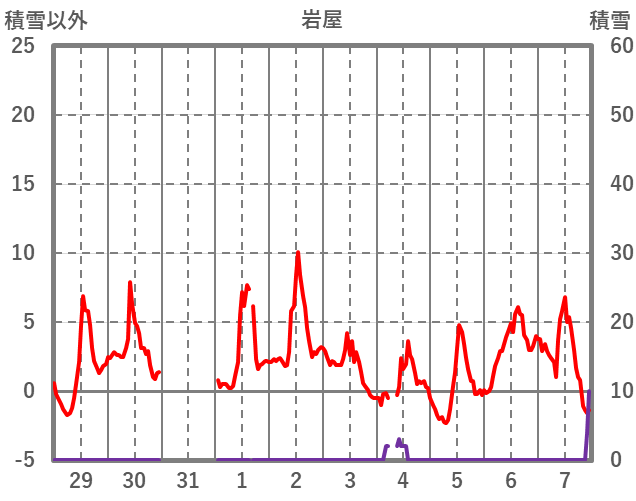 | 日 | 時 | 気温 | 降水 | 風向/風速 | 日照 | 積雪 | 降雪 |