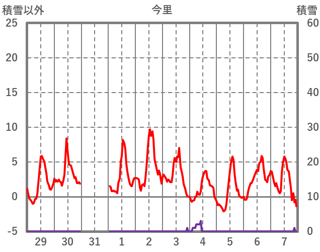 | 日 | 時 | 気温 | 降水 | 風向/風速 | 日照 | 積雪 | 降雪 |