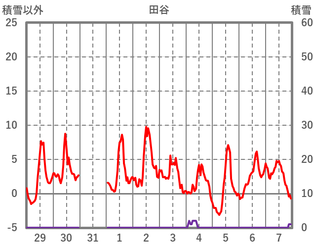 | 日 | 時 | 気温 | 降水 | 風向/風速 | 日照 | 積雪 | 降雪 |