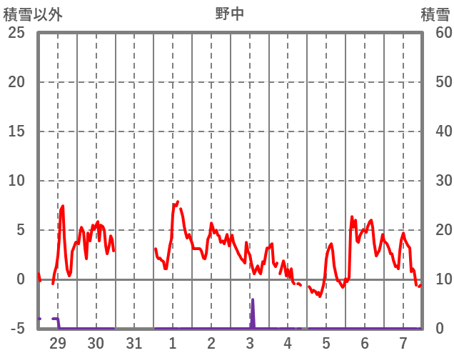 | 日 | 時 | 気温 | 降水 | 風向/風速 | 日照 | 積雪 | 降雪 |
