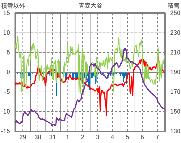 | 日 | 時 | 気温 | 降水 | 風向/風速 | 日照 | 積雪 | 降雪 |