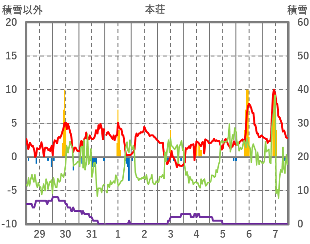 | 日 | 時 | 気温 | 降水 | 風向/風速 | 日照 | 積雪 | 降雪 |